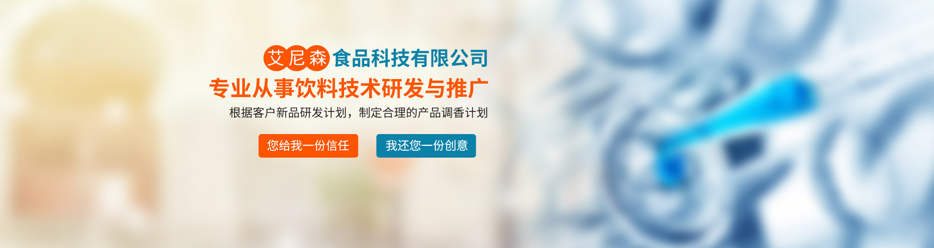 廊坊市艾尼森食品科技公司是一家專業(yè)從事飲料技術研發(fā)與推廣的公司,公司業(yè)務主要包括食品飲料技術咨詢與服務、產品定位與現有產品品質改進、新產品技術工藝研發(fā)等。公司坐落于京津冀核心地帶--廊坊市,位置得天獨厚,現與京津多家研究所形成戰(zhàn)略合作關系,為多家上市公司及知名企業(yè)提供技術支持與原材料供應。